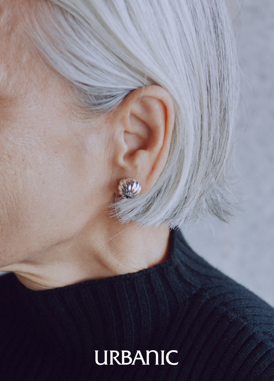 半球状の表面に渦巻き模様が精巧に刻まれているピアス。どんな日にもお使い頂けますますよう、控えめなサイズ感やシンプルなデザインで仕立てました。時を重ねるごとに増す自然なスクラッチと、柔らかな銀の輝きが魅力のアイテムです。