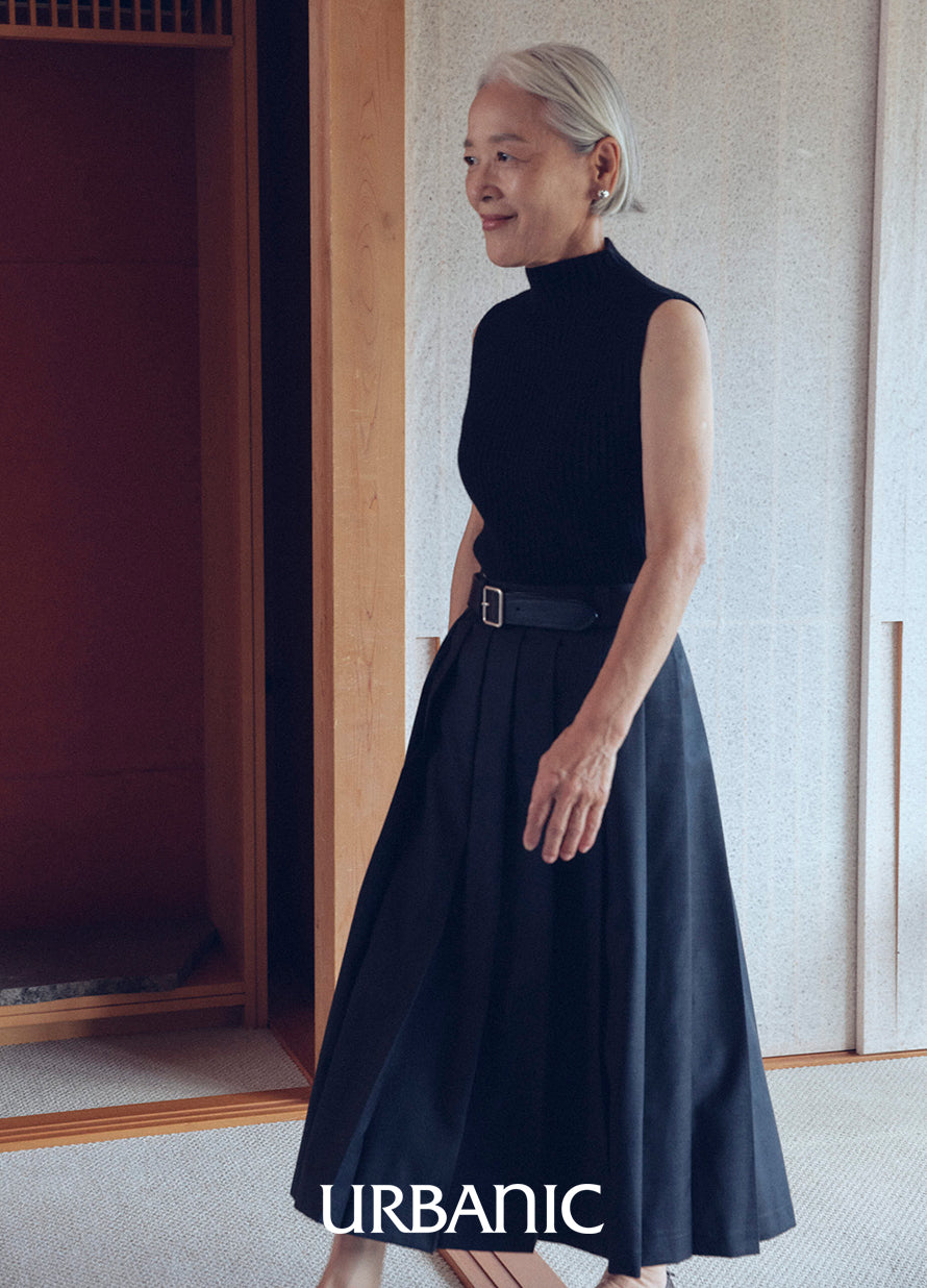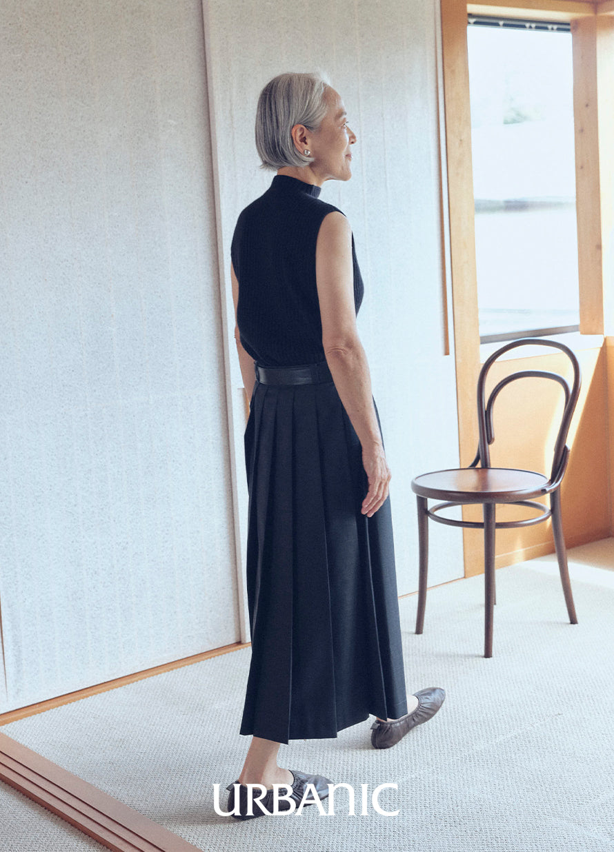 優雅なプリーツディテールがクラシックで美しい装いを完成させてくれる『Hiro Pleated Skirt(ヒロ プリーツスカート)』。ウール30%やポリエステル70%混紡の落ち着いたチャコール色の生地を選び、既存のプリーツスカートより長い着丈のロングスカートとしてデザインされました。